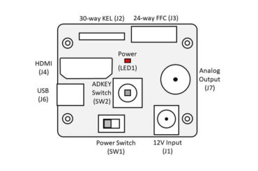 | HDMI connector (J4) | Connector for HDMI camera output. The protective insert needs to be removed from the HDMI socket (J4) before use. With a suitable HDMI cable, connect the evaluation board to a HDMI monitor/display. If you intend to use 4K, the monitor and cable will need to be able to support 4K video. |