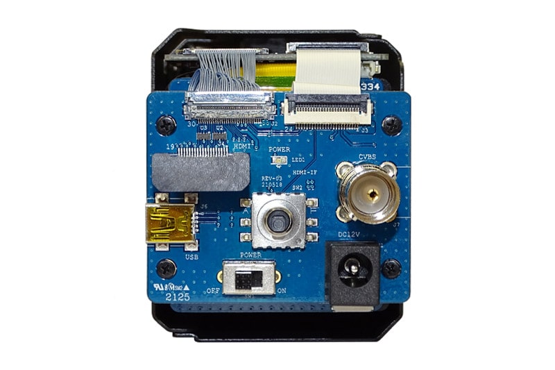The Evaluation Board provides the camera with power and VISCA communication over USB. It gives easy access to HDMI and analog video outputs and push-button control of zoom/focus and the on screen menu system.